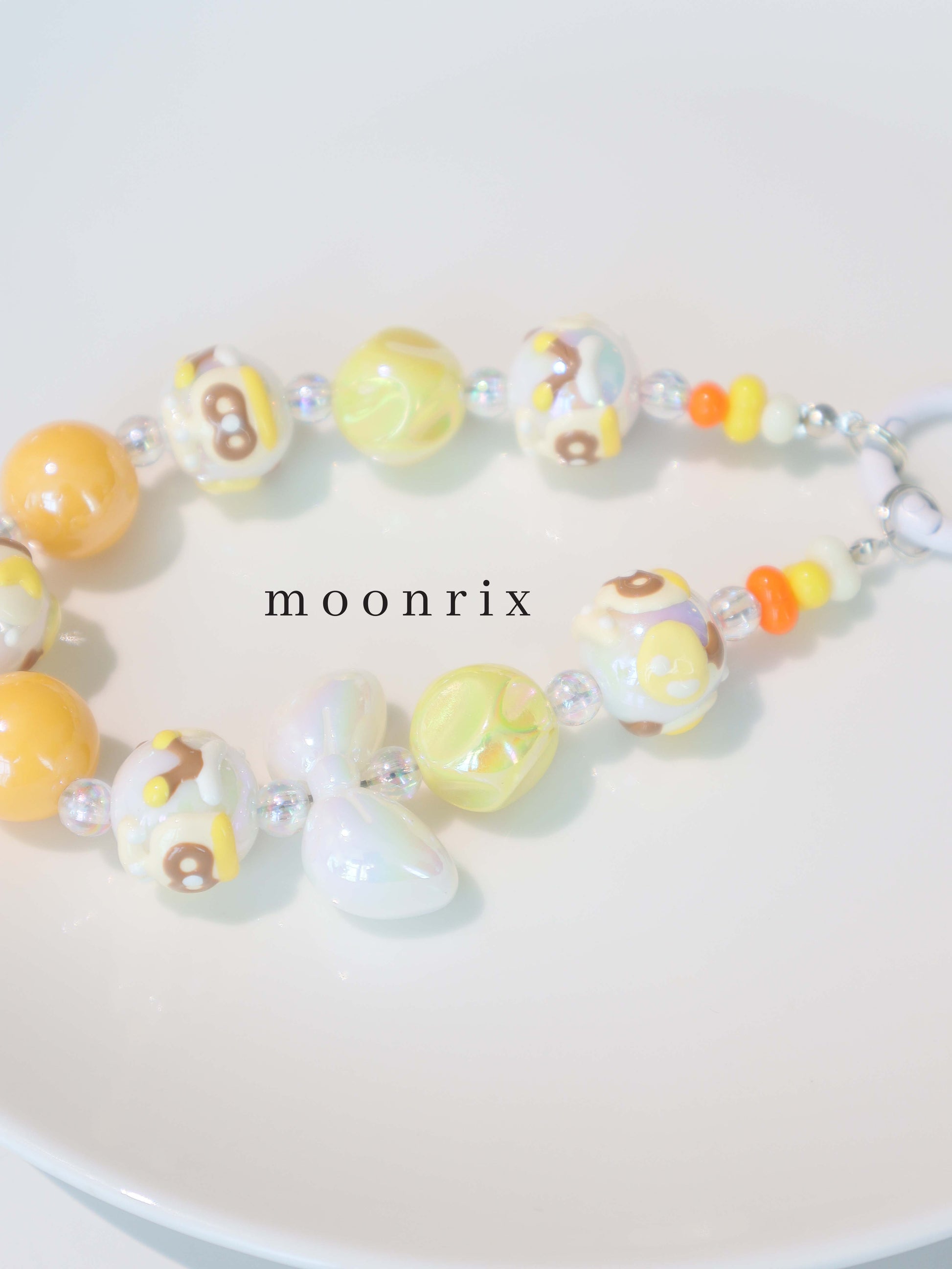 Featuring glossy iridescent beads paired with handcrafted candy-pattern spheres in soft yellow, it’s like carrying a pocketful of cotton candy skies.