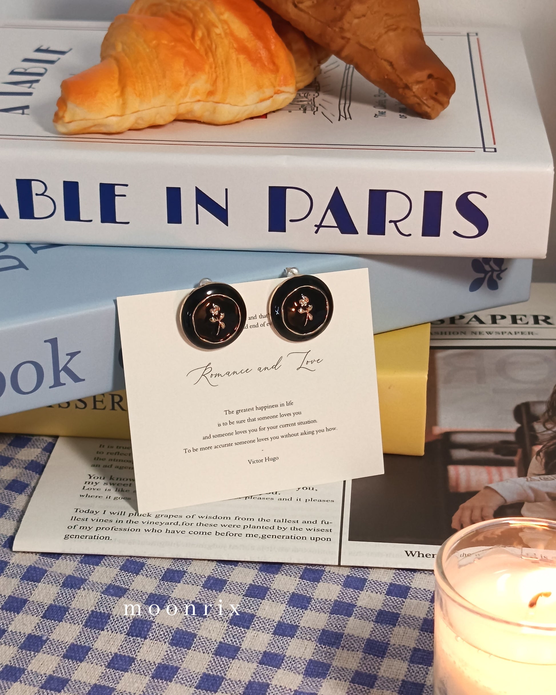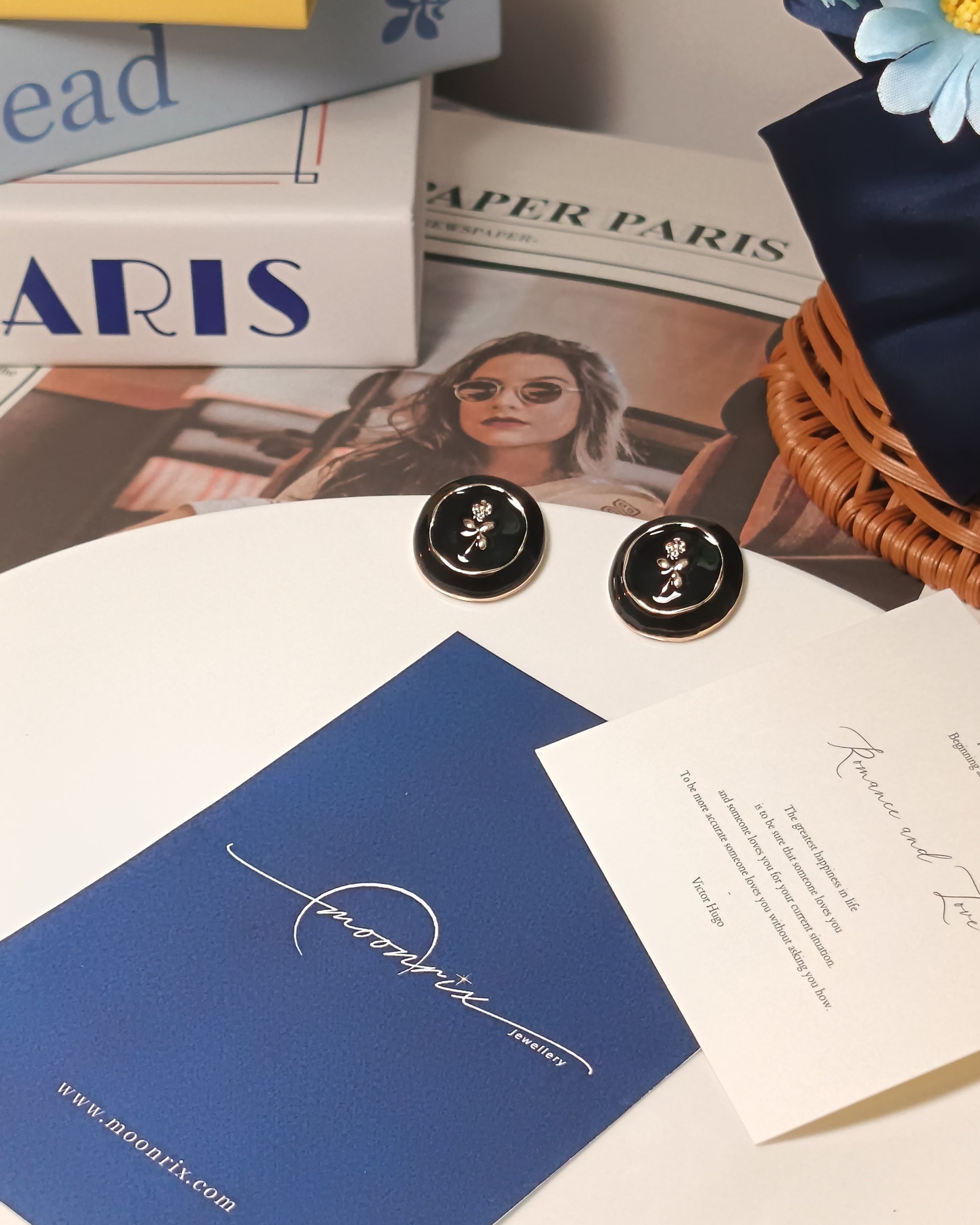 Classic charm with a Parisian twist—Rose de Jardin is an ode to timeless femininity. These round enamel earrings feature a glossy black backdrop adorned with a delicate gold rose motif, accented with a subtle crystal bloom at its center.