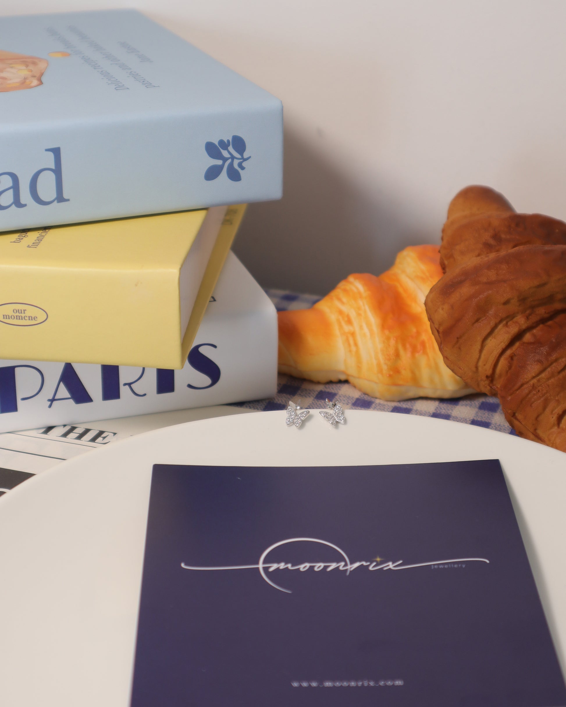 Crafted with precision, each stud features a delicate butterfly design adorned with sparkling zirconia stones. The elegant and dainty silhouette makes them perfect for both everyday wear and special occasions, adding a touch of grace to any ensemble.